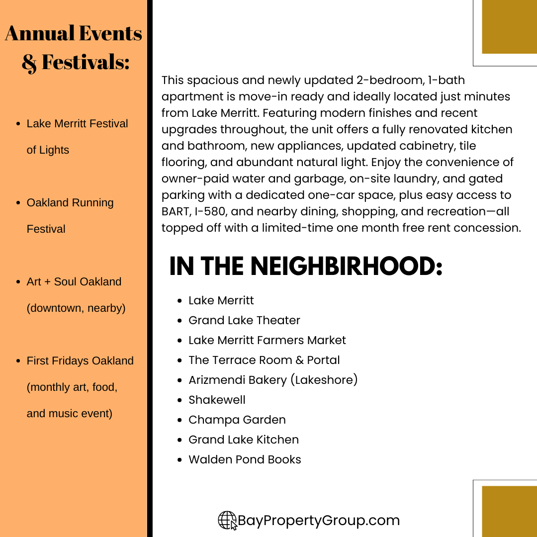 This tastefully updated 2 bedroom unit features a fully renovated kitchen and bathroom. The property features lots of natural lighting as well as new appliances, new cabinets, and a gated parking area with a dedicated 1 car parking garage. The unit is minutes away from Lake Merritt, I-580 entrances, BART station, and more!